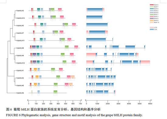 为了更好地分析葡萄的bHLHs,研究进行了单独的发育进化树、基因结构和基序分析(图6)。可以看到, VvbHLHs分为3类,与蛋白系统发育进化树分类一致。可以发现葡萄bHLH家族成员全部具有编码区域(coding sequences, CDS),除VvbHLH1、VvbHLH2、VvbHLH5、VvbHLH6、VvbHLH8、VvbHLH10和VvbHLH11外都具有非翻译区(untranslated regions, UTR),不具有的可能是没有注释出来。同时,葡萄bHLH家族成员均含有Motif 1,表明了bHLH家族的相对保守性。此外,包含相同种类保守基序的bHLH成员进化关系较近。根据Motif差异发现,Group 3亚族成员均含有Motif1、Motif2、Motif3、Motif5和Motif7;Group 4亚族成员均含有Motif1、Motif2、Motif3、Motif 5、Motif 7和Motif 8;Group 6亚族成员则含有Motif1、Motif2和Motif 7。推测不同的分支所包含基序的不同可能是 VvbHLHs进化过程中发生功能分化的原因之一。
