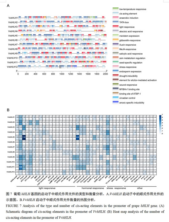 为了解葡萄bHLH基因的转录调控,本研究利用TBtools软件提取起始密码子上游2000 bp的葡萄家族基因序列,结合PlantCARE数据库分析统计顺式作用元件,手动去除冗余及无关序列后,再使用TBtools软件将结果可视化分析。结果表明,VvbHLHs的启动子中含有的元件类型和数量有所差异(图7)。基因的启动子区VvbHLH基因家族包含很多与非生物胁迫有关的作用元件,比如:昼夜节律响应元件、参与光响应的顺式调控元件、参与低温反应的顺式元件、干旱胁迫顺式响应元件和缺氧特异性诱导元件等(图7)。研究发现,所有的bHLH家族成员均含有光响应元件,推测其功能与光响应通路密切相关。葡萄中激素相关响应元件占比较多,其中脱落酸、茉莉酸甲酯响应元件是最多的,分别有23和24个(图7A)。因此,可以推测 bHLH 基因家族对生长素(IAA)、脱落酸、茉莉酸甲酯、赤霉素等激素信号的传播有着及其重要的作用。此外,我们发现6个VvbHLH基因(bHLH2、bHLH4、bHLH6、bHLH7、bHLH8和bHLH9)参与植物中玉米醇溶蛋白代谢调节,这表明VvbHLHs参与植物的代谢调节过程(图7A)。