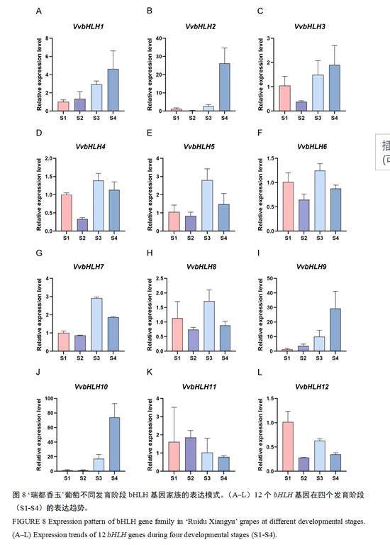 研究通过RT-qPCR技术分析了葡萄果实发育过程中VvbHLH基因的时空表达模式。研究表明,与其他VvbHLH基因相比,VvbHLH2的表达在不同发育时期具有显著的时空动态性,该基因在果实S4时期(成熟期)呈现较高的表达水平(图8)。在12个VvbHLH基因中,有5个基因(VvbHLH4、VvbHLH5、VvbHLH6、VvbHLH7和VvbHLH8)在果实S3时期(转色期)表达量显著升高,该时期正值葡萄转色阶段,推测可能与葡萄单萜类物质的积累相关(图8)。此外,VvbHLH1、VvbHLH2、VvbHLH3、VvbHLH9和VvbHLH10这5个基因在S4时期表达上调,VvbHLH11基因在S2时期(膨大期)表达上调,VvbHLH12基因在S1时期(幼果期)表达上调。这些发现表明VvbHLH基因在葡萄果实发育阶段具有不同的功能。
