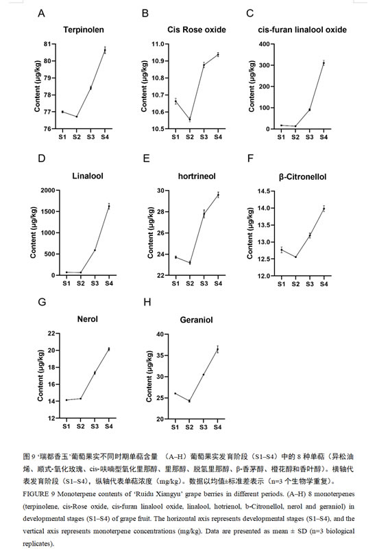 由于单萜代谢物主要在葡萄果实中积累,因此我们研究了单萜在葡萄果实发育的4个阶段的积累情况。研究鉴定出‘瑞都香玉’葡萄果实的4个发育时期均含有的8个关键单萜代谢物,包括异松油烯、顺式-氧化玫瑰、cis-呋喃型氧化里那醇、里那醇、脱氢里那醇、β-香茅醇、橙花醇和香叶醇。图9的结果表明,8种单萜在S1-S4时期的含量总体呈现上升趋势,尤其在S3-S4时期的增长速度较为急剧。具体来看,除橙花醇外,其它7种单萜的含量在S1-S2时期均呈下降趋势。