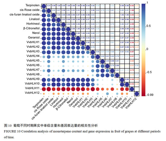 由于‘瑞都香玉’葡萄果实中单萜含量在S3时期(转色期)急剧上升,故采用Pearson相关性分析评估了S1-S4发育阶段单萜含量与12个VvbHLH基因表达水平之间的关系。可以看出,葡萄中bHLH家族成员的基因表达水平之间也存在一定的相关性(图10)。研究发现,VvbHLH1、VvbHLH2、VvbHLH3、VvbHLH9和VvbHLH10均与葡萄果实中单萜含量呈现显著正相关;VvbHLH11则与葡萄果实中单萜含量呈现显著负相关(图10)。具体来看,VvbHLH1对葡萄果实中异松油烯、cis-呋喃型氧化里那醇、里那醇、脱氢里那醇、β-香茅醇和香叶醇含量增长显著正相关(P<0.05),而对橙花醇含量增长显著正相关(P<0.01)。VvbHLH2对葡萄果实中cis-呋喃型氧化里那醇和里那醇含量增长显著正相关(P<0.05)。VvbHLH3对顺式-氧化玫瑰含量增长显著正相关(P<0.05)。VvbHLH9和VvbHLH10均对异松油烯、β-香茅醇、橙花醇和香叶醇含量显著正相关(P<0.05),对cis-呋喃型氧化里那醇和里那醇含量显著正相关(P<0.01)。VvbHLH11对脱氢里那醇含量显著负相关(P<0.05),对顺式-氧化玫瑰含量显著负相关(P<0.01)。