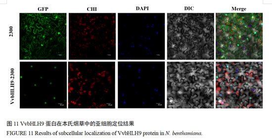 为验证VvbHLH9蛋白的预测定位结果,我们成功克隆了VvbHLH9基因的全长CDS序列,将其连接至pCAMBIA2300-GFP载体并转化至GV3101感受态细胞。使用验证成功的农杆菌菌液浸润本氏烟草叶片后观察结果。通过亚细胞定位发现,未插入VvbHLH9基因的绿色荧光蛋白在本氏烟草各细胞器中均有表达,而与VvbHLH9蛋白融合的绿色荧光蛋白仅在细胞核中表达,证明VvbHLH9基因在细胞核中表达并发挥功能(图11)。