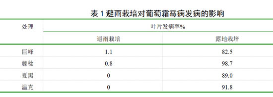综上所述,避雨栽培避免了雨水的浇淋,创造了不利于霜霉病发生的条件,大大降低了霜霉病的发生,但在果园植株和枝叶过密,通风透光不良,空气和地面湿度大时,应注意霜霉病的发生。同时,避雨栽培也创造了适宜白粉病发生的高湿但叶面干燥的环境,且减弱了光照强度,有利于白粉病的侵染和流行。