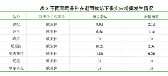 (2)在幼果期,进行果实白粉病的调查,分析避雨栽培下不同品种白粉病的发生情况。