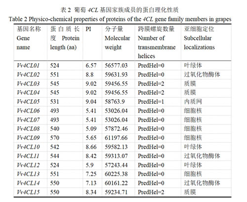 以拟南芥7个4CL基因为参照,从葡萄基因组中鉴定了15个4CL家族成员(Vv4CL01~Vv4CL15)。从表2可知:蛋白长度493~570 aa,分子量53.02~61.20 kDa,Vv4CL09蛋白序列最长、Vv4CL06和07的最短;等电点两极分化,部分为碱性蛋白,部分为酸性蛋白。Vv4CL03、04、05、15蛋白含1~2个跨膜螺旋且拓扑结构有差异。亚细胞定位预测结果发现,Vv4CL01和10蛋白定位于叶绿体上,Vv4CL02、11和14蛋白定位在过氧化物酶体上,Vv4CL03、04和15蛋白定位在质膜上,Vv4CL05蛋白定位于内质网膜上,其余5个成员定位于细胞核中。