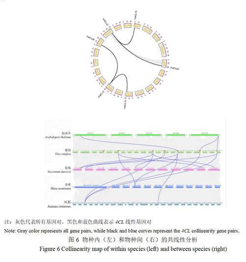 图6所示为葡萄Vv4CL基因家族的共线性可视化图谱。结果显示,Vv4CL基因家族成员在葡萄染色体上呈现片段复制、串联重复的分布特征,共鉴定出3个主要共线性块(Collinear Block)和4对同源基因对,基因对Vv4CL02/Vv4CL07、Vv4CL07/Vv4CL10、Vv4CL06/Vv4CL15、Vv4CL14/Vv4CL15之间存在共线性关系,并被划分到同一亚类(Vv4CL06/Vv4CL15除外),由此可知4CL基因家族在葡萄进化过程中经历了多次基因组复制事件。葡萄与拟南芥、蓝莓、香蕉和凤梨之间的基因共线性分析发现,它们之间的同源基因分别有3对、6对、2对、4对。共线性分析指出葡萄与蓝莓之间的基因对匹配数量远超过葡萄与香蕉之间,这与它们的进化关系相吻合。