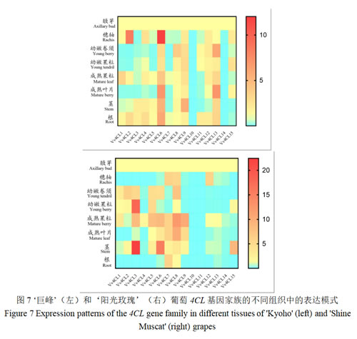 对比分析发现,Vv4CL基因的表达模式在两品种中存在差异。在穗轴中,‘巨峰’中Vv4CL2、6高于‘阳光玫瑰’;而‘阳光玫瑰’的Vv4CL3在幼嫩果粒和茎中的表达量高于‘巨峰’。