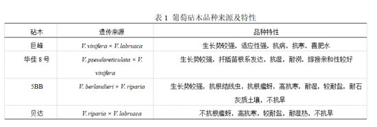 试验于上海平棋葡萄种植专业合作社进行(121°40′21″E,31°6′51″N),该地属北亚热带季风性气候,四季分明,温和湿润。年平均气温为18.0 ℃,年降水量为1169.3 mm,年平均日照时数为1706.4 h。所用材料为7年生‘阳光玫瑰’葡萄嫁接成年树,砧木分别为‘巨峰’‘华佳8号’‘5BB’ ‘贝达’(表1),以树龄相同的‘阳光玫瑰’葡萄自根树作为对照。试验在8 m × 25 m的避雨栽培设施内进行,按4.0 m × 2.8 m的株行距定植,采用平棚架‘一’字型整形叶幕。田间土肥水管理及病虫害防治措施均按常规方法进行。