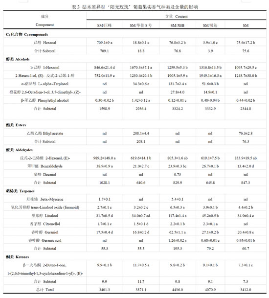 2.1.3 砧木差异对‘阳光玫瑰’葡萄果实香气种类及含量的影响