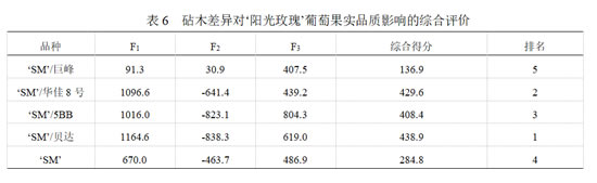 应用建立的葡萄果实品质综合评价模型(F=0.490F1+0.307F2+0.203F3)计算综合得分,不同砧木‘阳光玫瑰’的优劣顺序为:‘SM’/‘贝达’最佳,其次是‘SM’/‘华佳8号’、‘SM’/‘5BB’、‘SM’,‘SM’/‘巨峰’排名最后(表6)。
