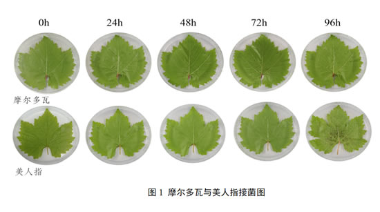 目前,摩尔多瓦品种在抗病性方面表现极佳,石家庄地区近乎免疫,甚至高于多个山葡萄与美洲种品种(普遍认为高抗)。同时,摩尔多瓦在果实方面表现优异,果实品质果粒大、果粉厚、品质上佳。成为筛选抗病、粒大、优质种质的优秀亲本资源。因此本研究计划选取摩尔多瓦与美人指开展室内霜霉病接菌试验,并观察接种后0h、24h、48h、72h、96h、120h、144h、168h时两个品种的发病情况。并依据结果选取时间段进行转录组+代谢组测序。