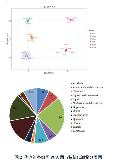 为进一步阐明葡萄霜霉菌感染的生理机制,在UPLC-MS/MS平台上进行了摩尔多瓦叶片和美人指叶片(0h、24h、48h)的代谢变化分析。主成分分析(PCA)表明,除SD24h与SD48相对接近外,6组叶片样品被PC1和PC2明显分离。6个样品共鉴定出1800种代谢物,分为13类,主要是类黄酮类、酚酸、萜类、脂类、木酚素和香豆素等,其余类分为“其他”组。
