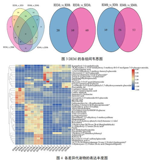为了深入了解六组间代谢物的变化,两两比较之间的VIP≥1和≥2或≤0.5,以及 P值<为0.05,用于鉴别差异积累代谢物(DAMs)。差异代谢物分析结果显示,葡萄霜霉菌侵染后分别有356个(RD24h_vs_RD0h)、305个(RD48h_vs_RD0h)、304个(RD48h_vs_RD24h)、294个(SD24h_vs_SD0h)、294个(SD48h_vs_SD0h)、197个(SD48h_vs_SD24h)、598个(RD24h_vs_SD24h)、669个(RD48h_vs_SD48h)代谢物发生显著变化。同时,我们对6组的不同组合进行了维恩分析。结果表明,通过RD24h_vs_RD0h和RD24h_vs_SD24h、RD48h_vs_RD0h和RD48h_vs_SD48h的比较得到149和156个,主要含有类黄酮、芪类、萜类。结果表明,从上述6个组中同时鉴定出45个dem,主要含有12个黄酮类、11个芪类、6个酚酸类和6个萜类。值得注意的是,虽然表明两个品种的这些代谢物对葡萄霜霉菌的感染均有响应,但含量的差异导致了抗性的差异,特别是,脱落酸、转白藜芦醇、白藜芦醇及其衍生物、茉莉酸的含量存在较大差异。