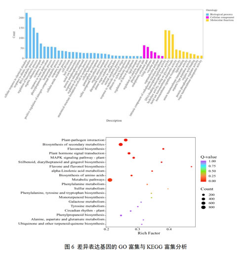 为进一步阐明葡萄对霜霉菌侵染的分子机制,对0、24、48h(每阶段3个生物重复)的叶片进行了测序,构建了18个cDNA文库。去除低质量数据后,获得了约149.95g(Gb)的clean date,每个样本的平均clean date约为8.33 Gb。18个文库的GC含量(%)为45.78%~46.94%,Q30%的最小值为92.81%。超过93%的clean reads与葡萄参考基因组相匹配,上图率从93.86%~95.62%不等,唯一上图率从90.39%~92.29%不等。这些结果表明,测序数据的准确性和质量高度满足了进一步分析的需要。