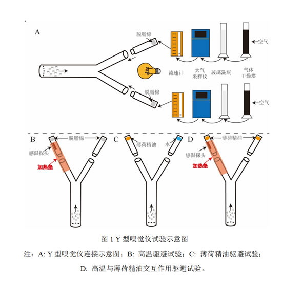99% 薄荷精油、乳化剂吐温-20、油浴锅、玻璃反应釜、自制 20 孔板、HOBO 温度计、Y 型嗅觉仪(主臂长 20 cm,侧臂长 15 cm,内径均为 2.5 cm,两侧臂间夹角为 45°)、玻璃洗瓶、气体干燥塔、大气采样仪(QC-3型)、30cm*30cm*30cm 亚克力板养虫笼、30cm*20cm 加热垫(功率 23 w)。