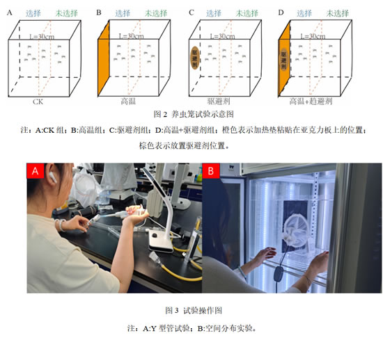 黑腹果蝇耐热性(高温敏感性)及驱避 RC90 浓度测定:测定成虫耐热性:取雌雄果蝇各30头,置于20孔板内,于油浴锅中以0.5℃/min速率从20℃开始升温,实验过程中启动 HOBOware 软件并用 HOBO 温度计探头定温度,记录每头果蝇跌落时的温度(CTmax)作为耐热指标。随后采用13个浓度梯度的薄荷精油,利用Y型嗅觉仪测定果蝇行为反应。在 Y 型管上盖上黑布,正前方放置均匀光源,大气采样仪设置流速 200 mL/min,室内温度 23±1℃(图1 A)。薄荷精油经乳化稀释后滴0.5 ml于棉球作为处理组,另一端对照为乳化剂与水混合液(图1 C)。通气10 min稳定气流后引入果蝇,5 min后记录选择情况,每组重复5次,每次用果蝇10头。计算驱避率(驱避率=[对照组果蝇数/(对照组果蝇数+处理组果蝇数)]×100%)并确定RC90(驱避率达90%的浓度)。高温与驱避剂交互作用对果蝇驱避行为选择偏好的影响:行为选择试验基于前期试验中薄荷精油驱避果蝇的CTmax 以及 RC90 浓度结果进行,三组处理分别为:高温/不高温、驱避剂/水、高温+驱避剂/驱避剂,每组试验 5 次重复,每次重复10 头果蝇,雌雄比例为 1:1,以此确定高温与驱避剂交互作用对果蝇驱避行为选择偏好的影响。针对一侧味源管加热作为高温组。高温/不高温组需要在一侧味源管包裹加热垫,连接感温探头,加热温度根据果蝇 CTmax 值确定,脱脂棉不需要加任何试剂(图1 B)。驱避剂/水组一侧味源管加 RC90 浓度的薄荷精油,另一侧添加水与乳化剂的混合液作为对照组(图1 C)。高温+驱避剂/驱避剂组,味源管设置同高温/不高温组,两侧脱脂棉均需要加入 RC90 浓度的薄荷精油(图1 D)。