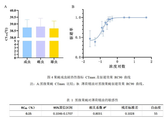 如图 4A 所示,黑腹果蝇成虫 CTmax 为 38.74 ℃,其中雄虫的 CTmax 为 38.67 ℃,雌虫的 CTmax 为 38.81 ℃,雌虫比雄虫高 0.14 ℃,雌雄成虫之间差异不显著(t=0.92,df=58,P=0.361)。如图 4B 所示,不同浓度薄荷精油对果蝇驱避结果拟合曲线得到的 RC90 浓度为 0.15%(表 1)。