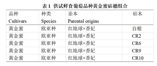 黄金蜜系河北昌黎果树研究所从红地球和香妃杂交后代中选育的优良鲜食品种,果穗大、甜度高、具玫瑰香味、耐贮运且无需激素处理。为探索该品种的适栽范围及品种推广,渭南葡萄研究所与河北昌黎果树研究所联合,开展黄金蜜自根苗及4个砧穗组合在陕西渭南的引种表现,为黄金蜜的砧木选择及推广做好基础。