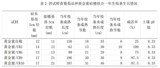 综上,黄金蜜/CR9和黄金蜜/CR10适合在渭南地区推广种植,具有生长势强、穗大等优点;黄金蜜/CR6在提升果实品质方面表现突出,可根据生产目标选择相应砧穗组合。