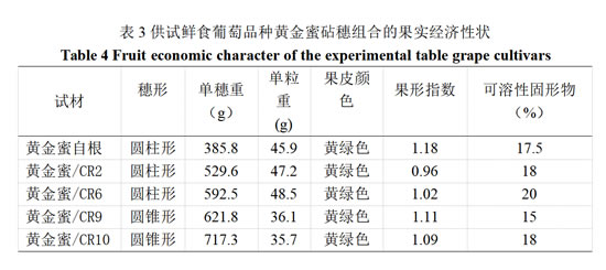 在栽培管理方式与水平基本一致、未使用任何生长调节剂花果处理的情况下,果实经济性状如表3所示。各组合果皮均为黄绿色,果粒近圆形。穗形方面,黄金蜜自根、黄金蜜/CR2和黄金蜜/CR6为圆柱形,黄金蜜/CR9和黄金蜜/CR10为圆锥形。单穗重以黄金蜜/CR10最高(717.3 g),黄金蜜/CR9次之,黄金蜜自根最低(385.8 g)。单粒重方面,黄金蜜自根、黄金蜜/CR2和黄金蜜/CR6间无显著差异,但均显著高于黄金蜜/CR9和黄金蜜/CR10。可溶性固形物含量以黄金蜜/CR6最高(20%),与黄金蜜/CR2、黄金蜜/CR10无显著差异,但显著高于黄金蜜自根(17.5%)和黄金蜜/CR9(15%)。