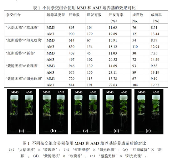 进一步,对无核葡萄胚挽救胚发育培养基的验证与应用,增加‘火焰无核’ב玫瑰香’、‘红斯威特’ב阳光玫瑰’、‘红斯威特’ב新郁’、‘紫脆无核’ב玫瑰香’、‘紫脆无核’ב阳光玫瑰’5个不同杂交亲本的组合,以MM3培养基为对照,进一步验证AM3培养基的培养效果。试验结果表明,AM3培养基分别在‘火焰无核’ב玫瑰香’、‘红斯威特’ב阳光玫瑰’、‘红斯威特’ב新郁’、‘紫脆无核’ב玫瑰香’和‘紫脆无核’ב阳光玫瑰’组合中获得的胚发育率比对照MM3培养基提高了8.24%、7.21%、9.49%、8.42%和6.86%,成苗率比对照MM3培养基提高了4.93%、4.15%、7.13%、3.35%和3.13%(表3-7,图3-12),即与对照MM3培养基相比,AM3培养基在5个杂交组合中获得胚发育率和成苗率平均提高了8.04%和4.54%,证明AM3培养基(MM3培养基 + 谷氨酰胺1.67 mM + 精氨酸1.21 mM + 谷氨酸0.74 mM + 组氨酸0.28 mM + 丙氨酸0.41 mM + 天冬氨酸0.23 mM + 亮氨酸0.12 mM + 甲硫氨酸0.09 mM + 异亮氨酸0.09 mM + γ-氨基丁酸0.11 mM + 赖氨酸0.05 mM)能够作为优化的胚发育培养基,并对胚发育具有良好的促进作用。