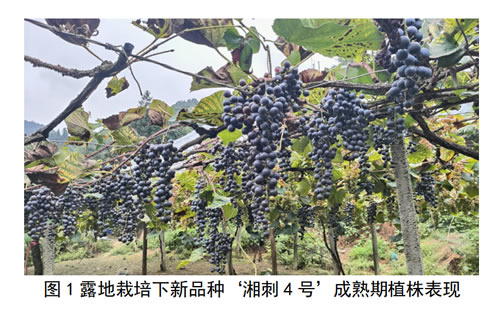 湖南农业大学葡萄团队依托本土刺葡萄资源,成功选育出刺葡萄新品种——‘湘刺4号’。其生长势相对其他刺葡萄品种稍弱,果穗分支极松散是区分于其他刺葡萄品种的重要特征。‘湘刺4号’具备优良品质,抗逆能力较强,且该品种酿制的葡萄酒色泽浓郁鲜艳,具丰富的营养价值和保健功效,因此更适合作为加工制汁的优质原料。