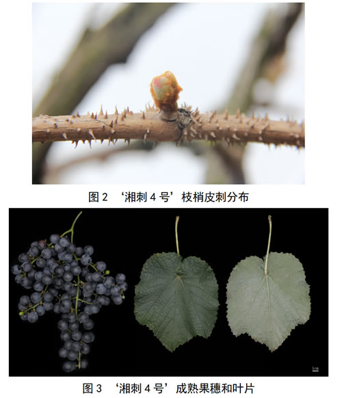 ‘湘刺4号’具典型东亚种群刺葡萄形态特征,两性花器官发育完整。品种形态学观察显示,其枝及叶柄部位分布有明显皮刺结构(图2),刺直立或先端稍弯曲,长2~4mm;幼叶呈鲜艳红棕色,叶片表面具明显蜡质层,叶背仅叶脉处有稀疏短柔毛分布,脉间光滑。第一花序分布集中于第3~5节位,以第4节位占比最高;成熟叶片呈心形,具三裂叶型特征;叶片较小,叶色浓绿,叶质厚度中等,较硬;叶缘锯齿多为双侧直形锯齿,数目少;叶柄洼呈现半开张至闭合状态,多闭合状。当年生新梢可着生1~3个花序,其中以2个花序居多。