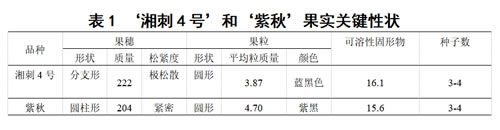 该品种果穗呈分支形,多歧肩,极松散,平均单穗重222 g,果穗平均纵径为28.9 cm(表1)。果粒为圆形,果形指数为1.0,果皮与果肉易分离,而果肉与种子难以分离,具肉囊结构,但不如‘紫秋’等刺葡萄明显;果粒大小3.3 cm2,单粒重3.87 g;果皮偏厚,其外被厚层果粉;转色初期为浅紫色,成熟后呈蓝黑色。种子形状呈中等卵圆形,与‘紫秋’相似,平均每颗果实含种子3.7粒,平均百粒重3.59 g,平均长6.01 mm,宽4.59 mm,长宽比1.31。