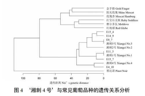采用9对SSR引物VChr3a[7]、VVMD5[8]、VrZAG79[9]、VrZAG62[9]、VVMD28[10]、VVMD27[9]、VChr14b[7]、VVMD7[8]、VVMD25[10],通过结合以上位点的基因型信息,构建常见葡萄品种系统发育树,进行了遗传分析。结果显示,‘湘刺4号’在系统发育树上属于独立进化支系,与现有刺葡萄品种以及鲜食葡萄品种存在显著遗传差异,表明其具有独特的遗传组成和种质特征。
