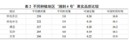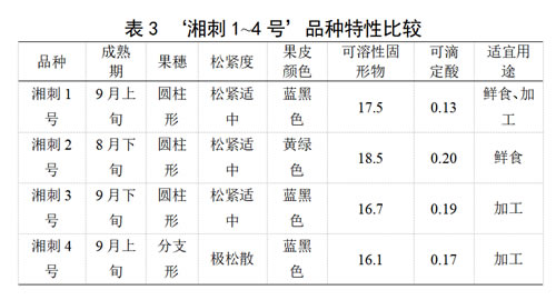 ‘湘刺4号’在湖南怀化、澧县、长沙等地进行了栽培试点。果穗极松散是该品种的最重要特色。其果实可溶性固形物含量较低,酸度偏低,无明显香味。但果实耐贮性好,果皮色素含量高,多酚含量高。平均可溶性固形物含量16.1%,可滴定酸含量0.17%(表2)。该品种多酚含量约19.44 mg/g,果皮涩味较强,成熟后涩味仍突出,鲜食口感独特,适宜于加工制汁与酿酒等。