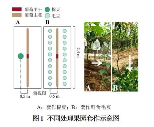 8年生‘巨峰’葡萄,树势一致,避雨栽培,“一”字形(株行距2.4 m×3.3 m)和高干自由形(株行距1.2 m×3.3 m),田间管理水平一致。棉豆(Phaseolus lunatus)种子购于福州闽信种子有限公司;鲜食毛豆‘毛豆 75’(Glycine max ‘Maodou 75’)种子购于重庆方正农业有限公司。