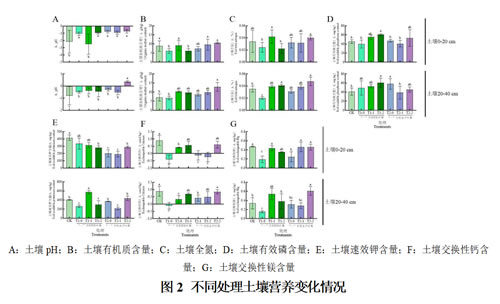 采用5点采样法对葡萄主干周围60 cm处 0~20 cm、20~40 cm深度的土壤进行采样。同一深度不同点位的土样混合后阴干、过筛,去除植物残体碎屑后测定土壤中全氮、有效磷、速效钾、交换性钙、交换性镁、土壤有机质含量、pH 值。每处理重复三次。土壤pH值:依照NY/T 1377-2007 采用电位法测定;土壤有机质含量:依照NY/T 1121.6-2006采用硫酸亚铁滴定法测定;土壤全氮:依照NY/T1121.24-2012采用自动定氮仪法测定;土壤全氮:依照NY/T1121.24-2012采用自动定氮仪法测定;土壤速效钾含量:依照NY/T 889-2004采用火焰光度计法测定;土壤速效钾含量:依照NY/T 889-2004采用火焰光度计法测定;各指标变化量:即改造翌年所测的数据与改造初年数据相减。