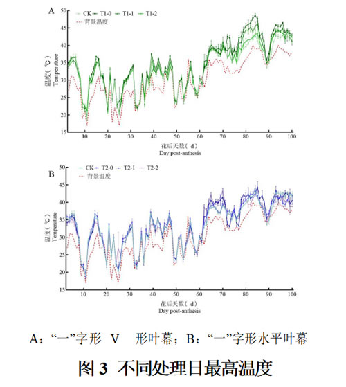 由图3可知,花后70 d前,各处理间温度差异均不显著;花后70 d起至果实采收结束,T1-0处理日最高温均高于其余处理,T1-1处理温度其次,T1-2、对照间差异不显著,且对照日最高温最低;于花后81/82 d,各处理均达到最高温度,背景温度为39℃,T1-0处理日最高温达到48.6℃,T1-1处理46.2℃、T1-2处理达到43.5℃,对照最低,为43.2℃。试验表明,T1-1、T1-2两套作处理均能降低夏季高温时期空气温度。由图3B可知,“一”字形改造水平叶幕的温度变化趋势与V形叶幕相仿,但各处理之间差异均不显著。试验表明,T1-1、T1-2处理均能降低两树形改造各处理盛夏高温时期的日最高温,且对“一”字形改造V形叶幕效果更好。