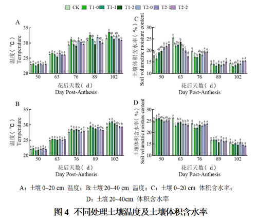 对“一”字形水平叶幕树体而言,花后50~102d各处理土壤0~20 cm温度整体呈上升趋势,花后76 d起T2-2温度均低于T2-0、T2-1,但各处理之间差异不显著;花后50 d起,各处理土壤20~40 cm深度温度均无显著差异,且花后76 d起,T2-2处理温度略低于其余处理,并于花后89 d较T2-0处理降幅最大,为4.31%;花后76 d起,T2-1处理土壤0~20 cm深度体积含水率显著高于T2-2处理,且于花后76 d后,各处理土壤0~20 cm 深度体积含水率均无显著差异;除花后63d外,T2-0、T2-1、T2-2处理土壤20~40cm深度体积含水率均高于对照,且除花后102d外均呈显著差异,此外,花后102d时T2-1处理土壤20~40cm深度体积含水率低于T2-2处理,但差异不显著。试验表明,套作棉豆与套作鲜食毛豆均能降低“一”字形水平叶幕改造翌年的土壤温度,但套作毛豆影响更为明显,且于花后76d起土壤0~20 cm 深度出现低于对照处理的土壤温度。