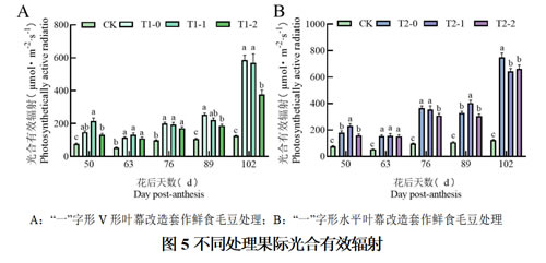 如图5所示,于整个果实成熟过程中,T1-0、T1-1、T1-2处理及T2-0、T2-1、T2-2处理光合有效辐射均显著高于对照;于花后50d、89d及102d,T1-2处理果际光合有效辐射显著低于T1-0处理,且于花后102d时T1-2处理较T1-0处理果际光合有效辐射降低了32.89%;于花后50d、89d及102d,T2-2处理果际光合有效辐射显著低于T2-0处理,差异最为显著。试验表明,在整个果实成熟过程中,改造初年套作棉豆对光照强度影响不甚显著,但套作鲜食毛豆使得两改造树形果际光合有效辐射均有一定程度的降低,且对“一”字形V形叶幕改造影响更为显著。