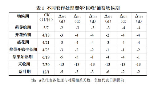 观察并记录改造后葡萄萌芽始期(5%的芽眼鳞片开裂的日期)、开花始期(5%的花帽脱落的日期)、盛花期(50%的花帽脱落的日期)、浆果开始生长期(95%的花朵落花的日期)、浆果始熟期(5%的首批果粒开始显色)、果实采收期(95%的果粒完成转色且 TSS≥17%的日期)、落叶期(75%的叶片变黄、脱落的日期),调查方法及记录标准参考《葡萄种质资源描述规范和数据标准》。