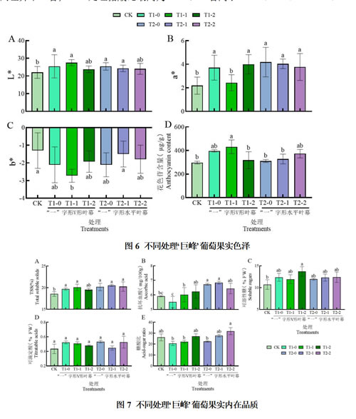 由图6可知,T1-0处理L*最高,显著高于对照;T1-0、T1-2、T2-0~T2-2处理a*值均显著高于CK及T2-1处理,其中T2-0处理a*值最高,达到对照的220.09%;T1-1处理果实b*值显著低于CK;T2-1处理果皮花色苷含量达431.05μg/g,显著高于对照,达到对照的144.97%。试验表明,树形改造处理可以显著改善果实着色情况,但套作鲜食毛豆处理可能使得“一”字形V形叶幕果皮a*值及花色苷含量出现下降。