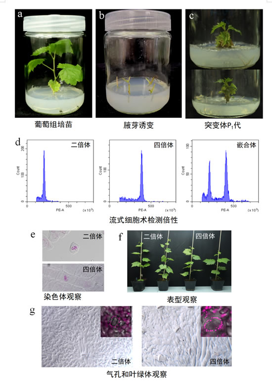 取葡萄组培苗的单芽茎段,分别接种在含有秋水仙素的MS培养基中培养(图b),72h后转移到MS培养基中继续培养成新的外植体(图c),试验重复3次,每个处理接种材料30个,于3周后调查存活率,连续观察变异情况。将存活的植株取嫩叶通过流式细胞术鉴定细胞倍性(图d)。