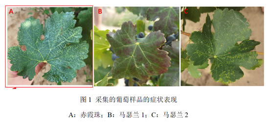2024年9月,在宁夏采集了3个酿酒葡萄样品,其中1个赤霞珠葡萄样品表现叶脉退绿,2个马瑟兰葡萄样品分别表现红叶和退率杂色症状(图1)。采集病叶在液氮中快速冷冻,通过干冰运送至百迈克生物科技公司,进行混样测序。