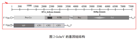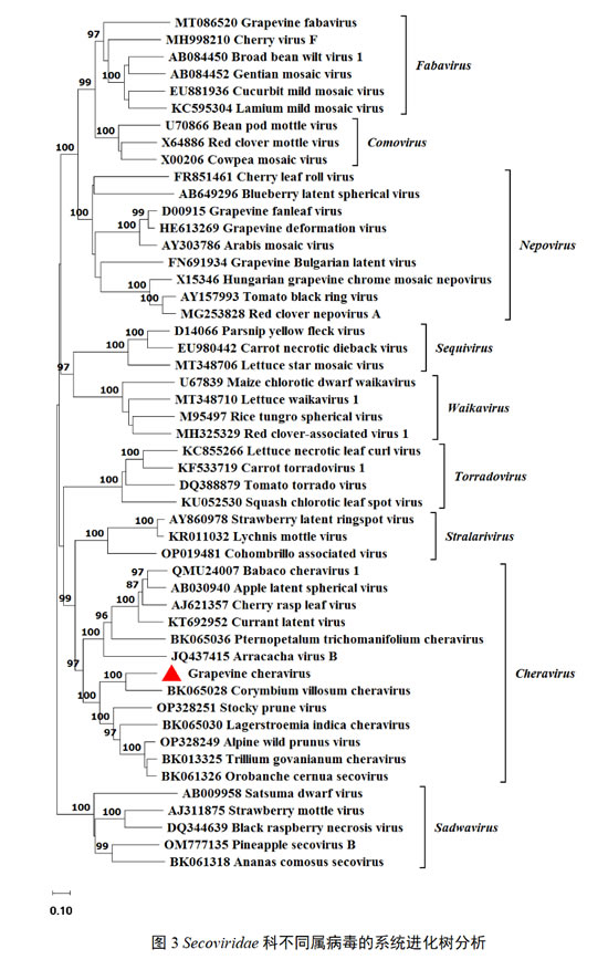 为进一步阐明GCheV的分类位置,选择家族Secoviridae中九个属的代表性成员RNA1 多聚蛋白中保守的Pro-Pol结构域的氨基酸序列(从3CL-Pro的CG基序到Pol的GDD基序)以构建系统发生树。结果显示GCheV与CvCV在Cheravirus属中聚类在一起(图3)。