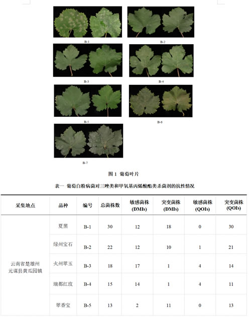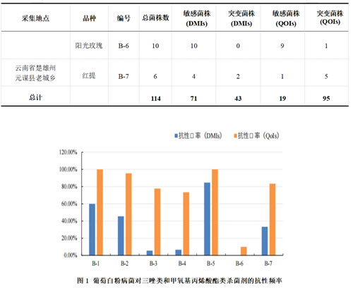 在元谋干热区,共采集了7个葡萄品种114份葡萄白粉病菌株,检测结果表明该地区对甾醇脱甲基抑制剂三唑类杀菌剂的抗药性频率为38%,甲氧基丙烯酸酯类杀菌剂的抗药性频率为83%。