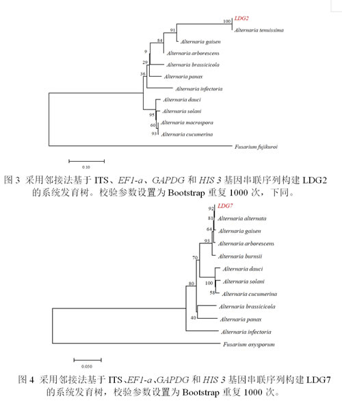 初步鉴定为细极链格孢(A. tenuissima)菌株选取LDG2为代表性菌株进行分子生物学鉴定。将代表菌株LDG2的四个真菌通用引物(ITS、EF1-a、GAPDG和HIS 3)的DNA序列提交给GenBank(http://www.ncbi.nlm.nih.gov),ITS、EF1-a、GAPDG和HIS 3的登录号分别为PP412068、PP417745、PP417744和PP539905。BLASTN分析发现,获得的ITS、EF1-a、GAPDG和HIS 3区域的序列与细极链格孢(A. tenuissima)相似度最高。使用邻接法(NJ)对四个基因的串联序列进行系统发育分析,代表性菌株LDG2与细极链格孢A. tenuissima isolate DD-ZX-TSC1(OQ026922.1,ITS)、isolate SY-1(OP980552.1,EF-1α)、isolate NCBC-3-2-2-1(OR485367.1,GAPDH)和isolate BA2(MH191343.1,HIS 3)归于同一进化枝,且相似性高达100%,亲缘关系极近,同为细极链格孢(见图3)。