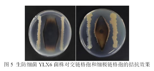 生防菌初筛:以细极链格孢和交链格孢为靶标病原菌,采用平板对峙法,在 PDA 平板距中心 3 cm 处划线接种生防菌,中心接种病原菌菌碟(直径 0.7 cm),25℃培养 5 d,筛选 “最长半径 / 最短半径>2” 的菌株。
