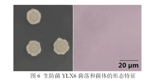 生防菌YLX6在LB固体培养基上培养28℃培养3 d后,菌落呈乳白色,形状为边缘不整齐的圆形,中央隆起,表面褶皱,有粘性,能形成芽孢,菌体为杆状。