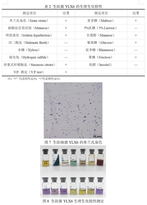 综上所述,基于形态学鉴定、生理特征和生化反应分析以及分子生物学鉴定,结合系统发育树分析,最终确定生防菌YLX6为枯草芽孢杆菌(B. subtilis)。