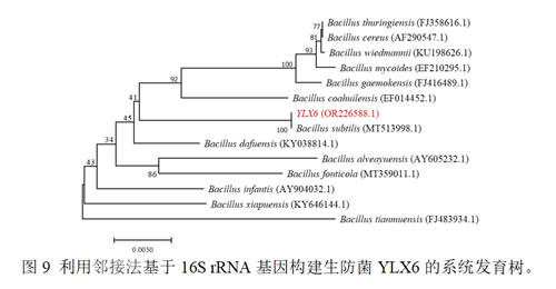 生防菌YLX6的PCR产物扩增和测序后得到长度为1429 bp的16S rDNA的产物。在NCBI上进行BLASTN比对,生防菌YLX6与菌株Bacillus subtilis HSY21(登录号为MT513998.1)的相似度高达为100%,上传GeneBank获得菌株登录号为OR226588.1。使用MEGA软件进行系统发育树分析,结果如图9所示,生防菌株YLX6与B. subtilis strain HSY21(MT513998.1)归于同一进化枝,相似性达98%,亲缘关系极近,同为枯草芽孢杆菌。