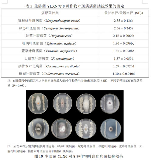 为明确筛选到的生防细菌YLX6对其它作物叶斑病病原真菌的拮抗效果,对本课题组保存的8种作物的叶斑病病原菌进行拮抗作用的测定,从表3和图10可以发现,生防菌YLX6对多种叶斑病害病原真菌均具有一定的抑制作用,特别是对绿苏叶斑病菌(Cytospora chrysosperma)的抑菌效果最好,最长半径比最短半径为2.56,其次是猕猴桃叶斑病菌(Neopestalotiopsis rosae)和蛇莓叶斑病菌(Diaporthe eres)。上述结果表明,生防菌YLX6有较广的抑菌谱,其在叶斑类病害的生物防治上展示出良好的潜力。