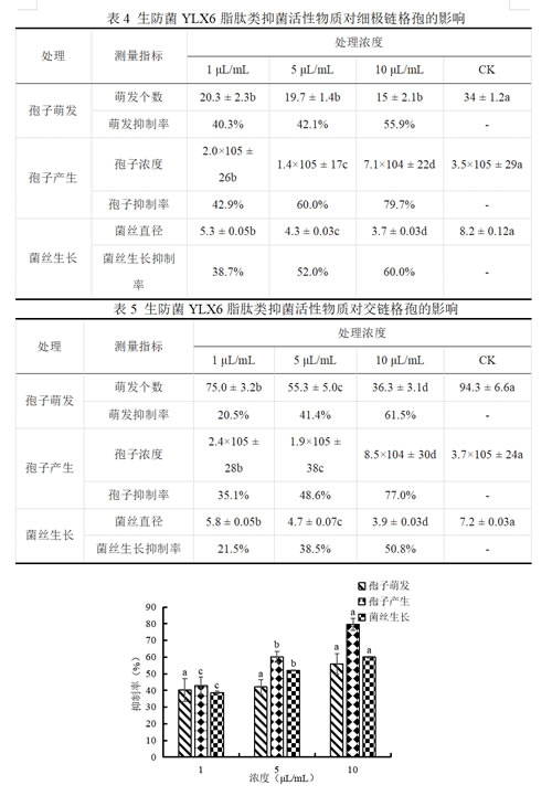 从生防菌YLX6的脂肽类提取物对蓝靛果叶斑病菌细极链格孢和交链格孢的影响可以看出,不同浓度处理对两种病原菌的分生孢子萌发、产生和菌丝生长都有显著抑制作用,且随着脂肽类纯化物质浓度的增加,抑制作用也越加明显。当浓度为10 μL/mL时,脂肽类提取物对细极链格孢的分生孢子萌发、分生孢子产生和菌丝生长的抑制率分别为55.9%、79.7%和60.0%,对交链格孢的分生孢子萌发、分生孢子产生和菌丝生长的抑制率分别为61.5%、77.0%和50.8%。