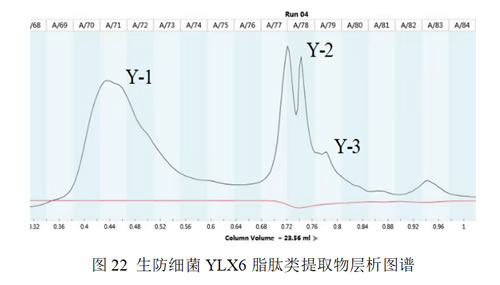 生防细菌YLX6的脂肽类提取物在200 nm至1100 nm之间全波长扫描,扫描结果显示:脂肽粗提物最高的吸收峰出现在215 nm处。因此,选用215 nm波长进行蛋白纯化分析步骤。经过分子筛按质量大小洗脱得到70-73管、77-78管和79管3组洗脱峰,依次命名为Y-1、Y-2和Y-3(图22)。
