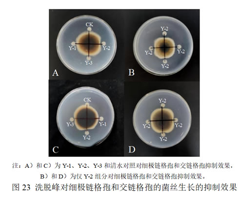 采用对峙培养法测定三组洗脱峰的抑菌活性,结果如图23所示,Y-2组洗脱峰对两种链格孢菌菌丝的拮抗效果均最好;而Y-3有一定效果,可能是因连峰原因;Y-1洗脱峰无抑制效果,故将第二组洗脱峰保留用于进一步分析。